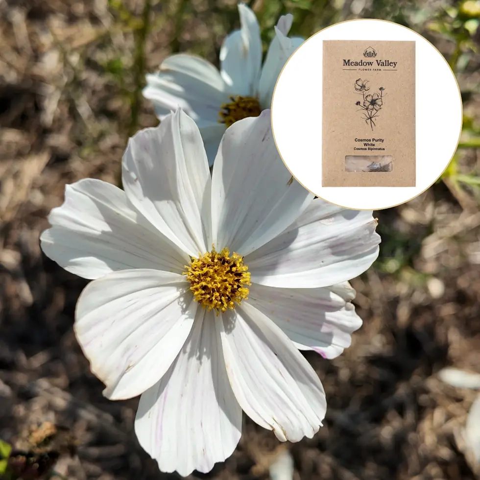 At Meadow Valley, we're thrilled to offer our latest addition: Cosmos Purity White Seeds. These stunning flowers are perfect for adding a touch of elegance and serenity to any garden. Renowned for their delicate white petals and easy-to-grow nature, Cosmos Purity White truly embodies the beauty and simplicity that our customers value. Join our community of gardening enthusiasts and let these graceful blooms transform your outdoor spaces. Shop local, support Meadow Valley, and cultivate purity with Cosmos Purity White Seeds today!